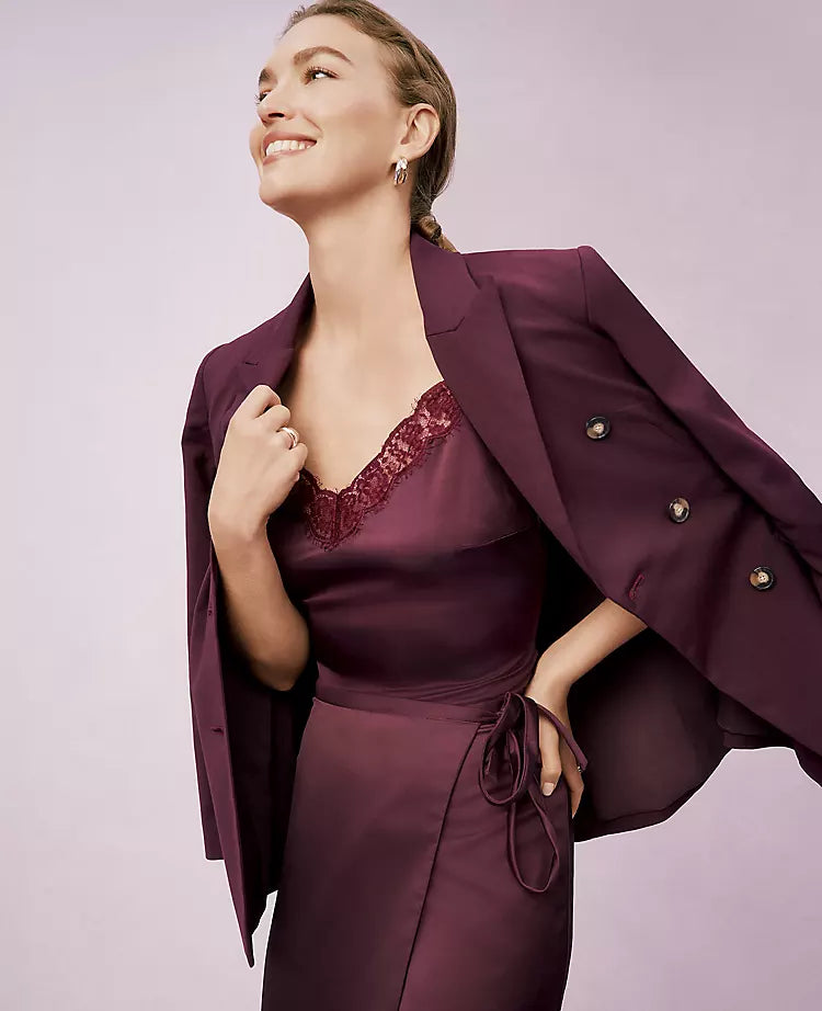 Fluid, versatile tank with delicate lace trim for a peek of detail — perfect for layering under blazers and knits. Designed with a V-neckline & adjustable spaghetti straps.